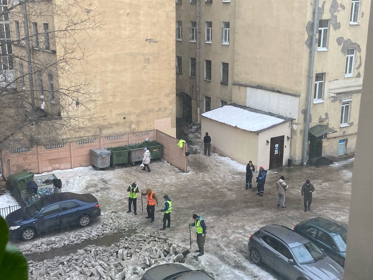 9 февраля замглавы администрации Центрального района Петербурга пообещал убрать дворы и кровли в центре города. «Меньше чем за неделю всё закончим», — заявил он на пресс-конференции ТАСС, объяснив задержки работ тем, что уборку во дворах тормозят припаркованные автомобили.