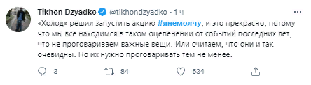 «Холод» призывает под хештегом #янемолчу рассказывать, что связывает каждого с Украиной. «Этой акцией мы хотим разорвать круг молчания, сложившийся вокруг темы войны с Украиной, и вспомнить о том, что многие из нас с ней крепко связаны», — говорится в сообщении издания.