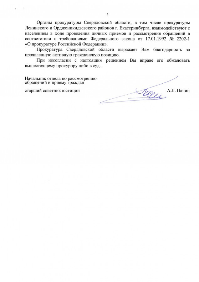 Но есть и огорчающие моменты. Так, в частности, начальник по рассмотрению обращений граждан прокуратуры Свердловской области Пачин А. Л., имея относительно недостаточный статус и вес в прокуратуре Свердловской области, не смог разрешить циклично повторяющиеся проблемы с неисполнением приказа Генеральной прокуратуры, ограничившись только констатацией факта.