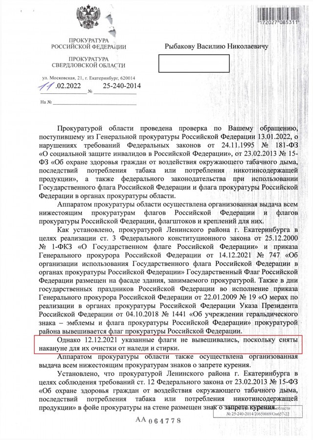 Так, в частности, Пачин указал, что цитирую: «…Как установлено прокуратурой Ленинского района г. Екатеринбурга …>,12.12.2021 указанные флаги не вывешивались, поскольку сняты накануне для их очистки от наледи и стирки».