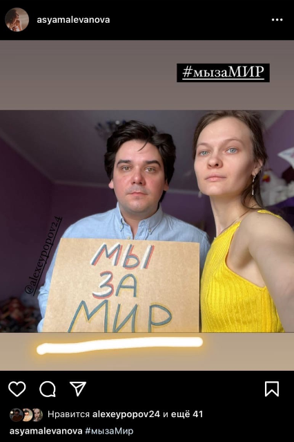 Актриса красноярского драматического театра им. Пушкина Ася Малеванова в своем профиле в Instagram опубликовала фотографию со своим коллегой Алексеем Поповым. На фото они держат табличку с надписью: «Мы за мир».«Это отразится на наших детях. Они от этого не отмоются уже. Они будут как те несколько поколений немцев, которые пытаются это сделать, но все равно чувствуют свою вину за деяния их предков. Так же будут чувствовать себя и наши дети. Это отвратительно», – высказалась Ирина Плеханова о начале военной операции.