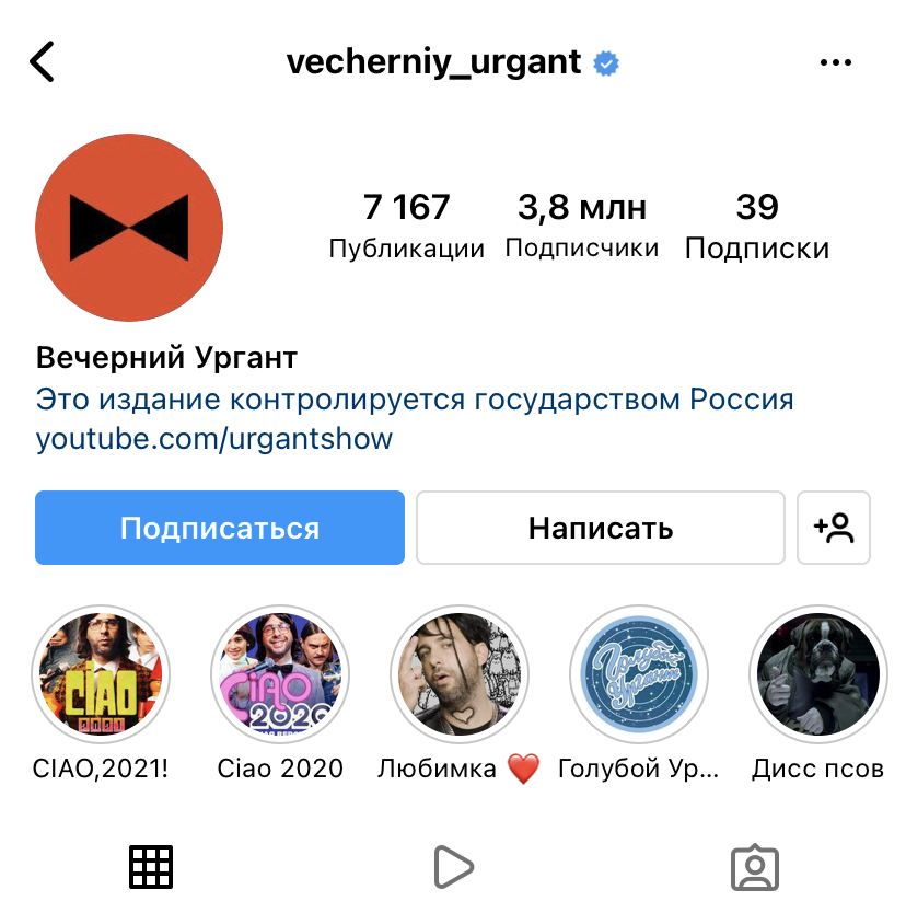 Инстаграм пометил «Вечернего Урганта» как издание, «контролируемое государством Россия». Аналогичные метки есть у государственных информационных агентств. Первый канал не показывал выпуски «Урганта» в последние дни, объясняя это изменением сетки вещания после начала войны.