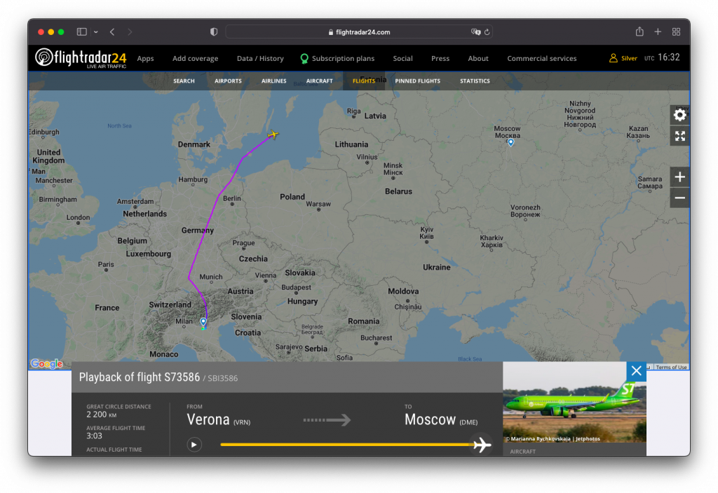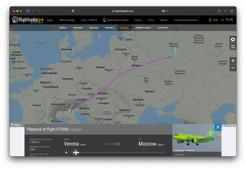 Запрет на полеты для российских авиакомпаний уже ввели Болгария, Латвия, Литва, Польша, Румыния, Чехия и Эстония. Вот как выглядит рейс из Италии в Москву до и после начала войны.