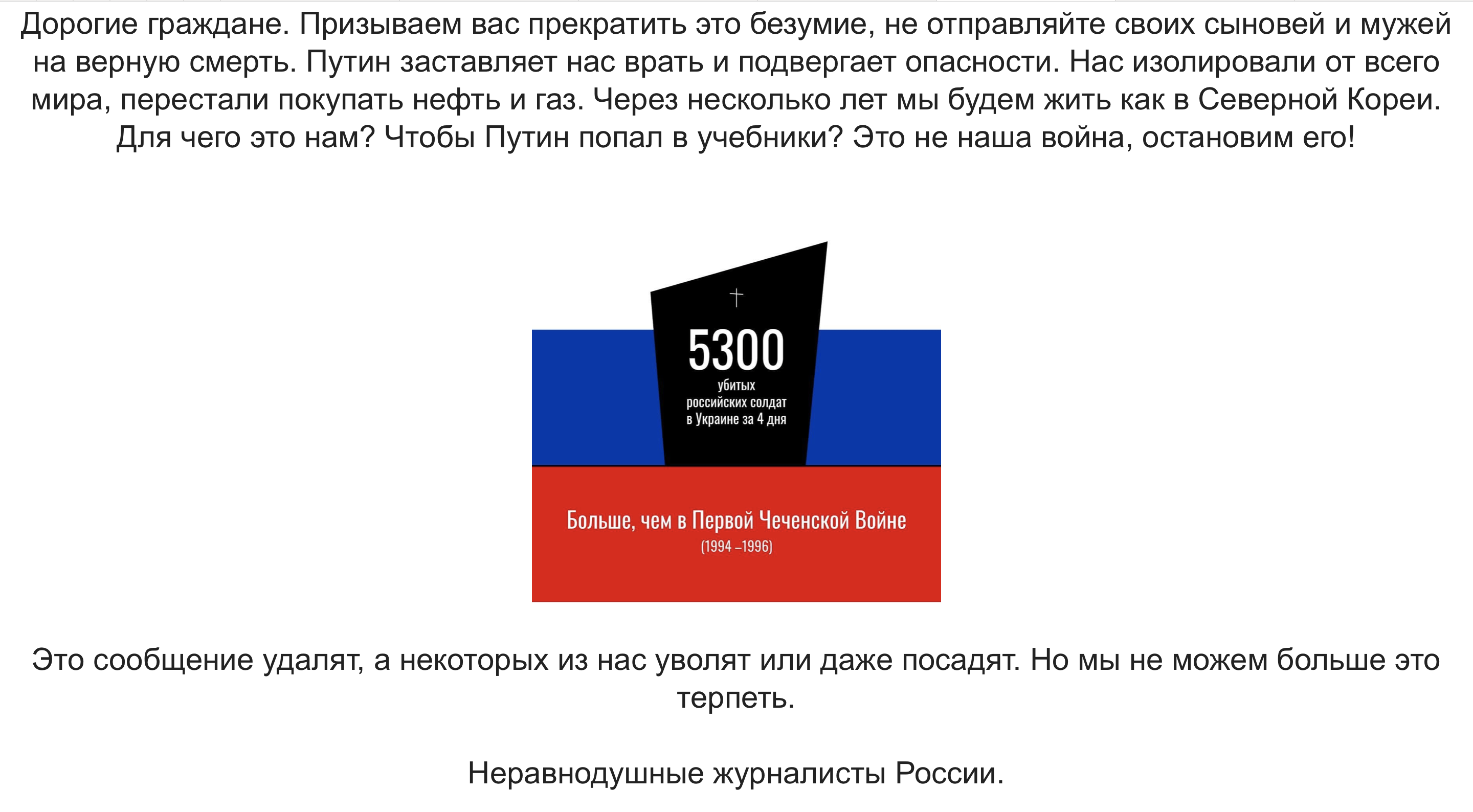 На их главных страницах появилось сообщение о войне в Украине и призыв «не отправлять сыновей и мужей на верную смерть». Под сообщением был логотип хакерской группы Anonymous.