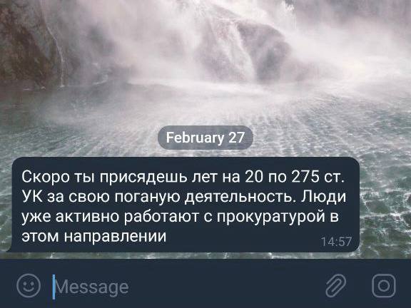 «Оскорбления, угрозы, пожелания смерти от неизвестных людей начали сыпаться мне на старую страницу во “ВКонтакте”, на мою действующую страницу и в телеграм. Звонили мне по телефону, написали, что против меня организовали коллективное заявление в прокуратуру по статье 275 УК — это измена Родине. Из-за того, что я якобы поддерживаю Украину, я изменница и предательница», — рассказала Ксения.