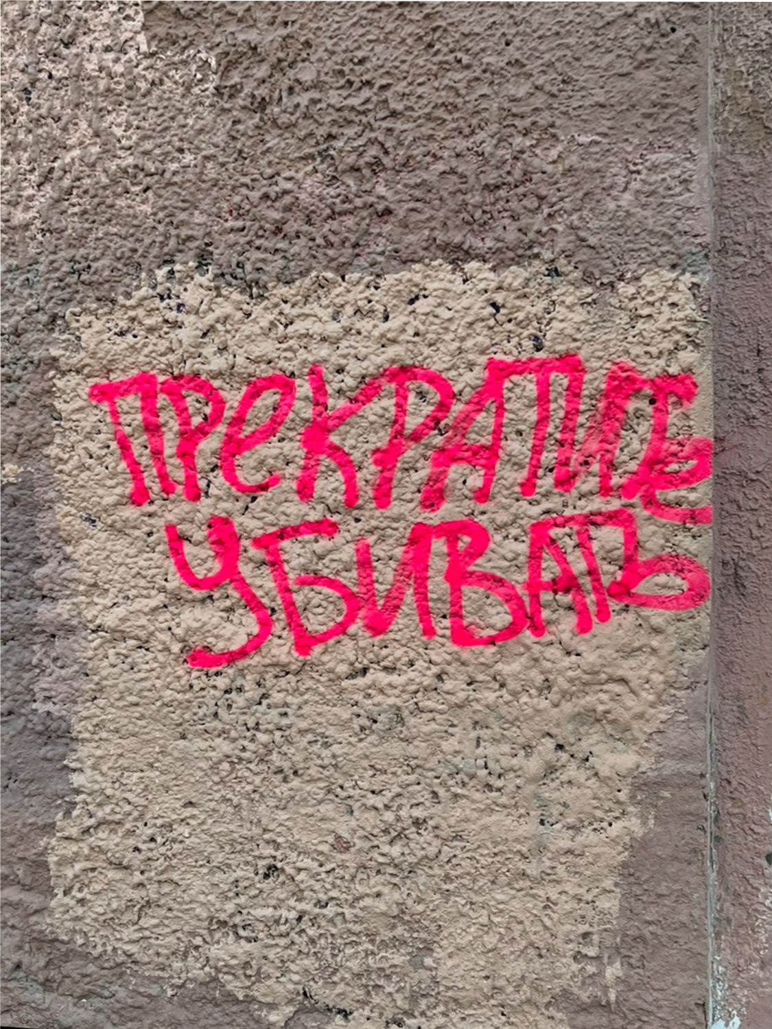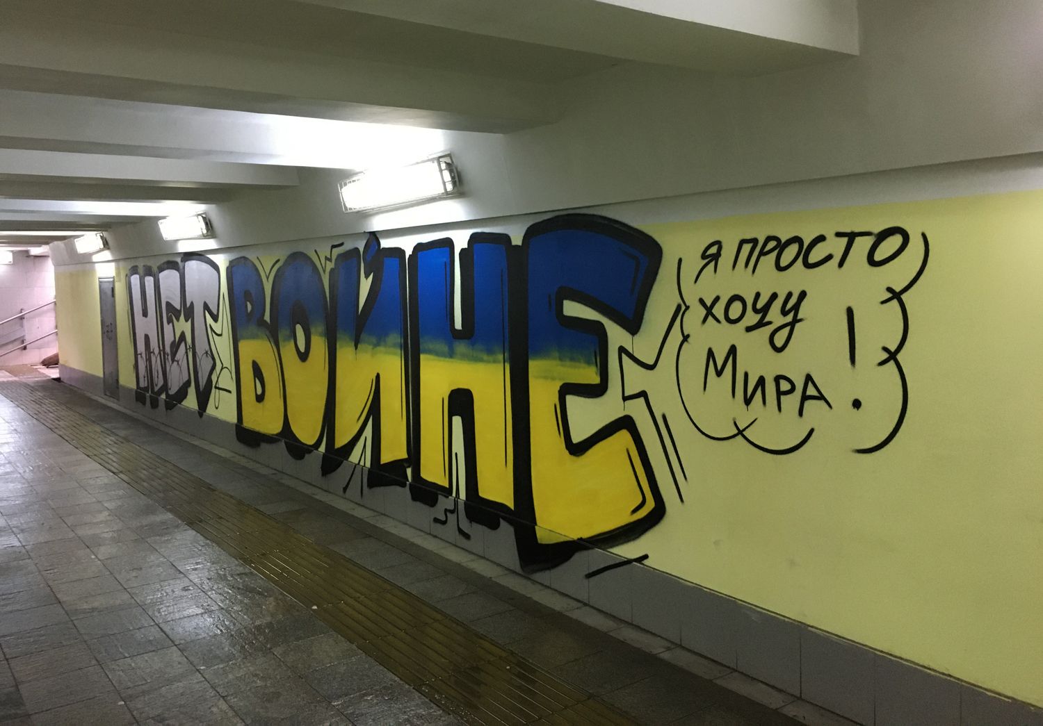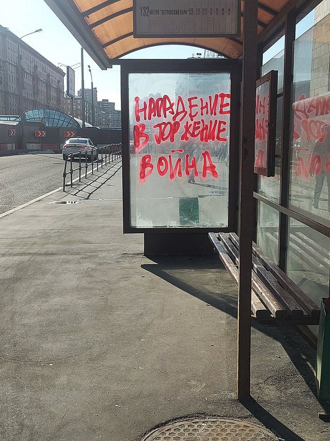 На улицах по всей стране — граффити, листовки и наклейки, осуждающие вторжение