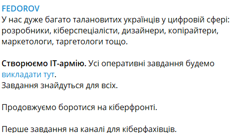 Не только Anonymous приняли участие в конфликте. 26 февраля министр цифровой трансформации Украины Михаил Фёдоров объявил о создании «IT-армии» — добровольческой кибердружины, которая должна помочь настоящим войскам.