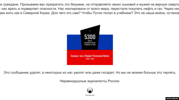 В ночь на 27 февраля участники Anonymous объявили, что взломали российские федеральные каналы с целью «транслировать правду об Украине». Жертвами, как сообщали хакеры, стали Первый канал, «Россия-1», СТС, НТВ, «5 канал», ТНТ и «Рен-ТВ». В их эфире якобы начали транслировать стихотворение украинского певца Дмитрия Монатика — он под кадры военных действий с разрушениями разных городов и сёл в результате атак спрашивал: «Ты этого хотела, русская власть? Спасти Украину — и пришла убивать?».