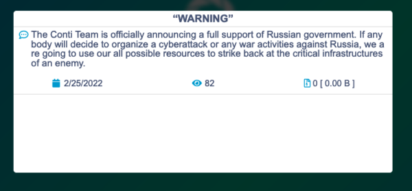 Однако вскоре после публикации сообщения участники Conti пересмотрел его, смягчив тон. В обновленном заявлении Conti говорит, что будет использовать «все свои возможности для принятия ответных мер в случае, если западные подстрекатели войны попытаются нацелиться на критически важную инфраструктуру в России или любом русскоязычном регионе мира».