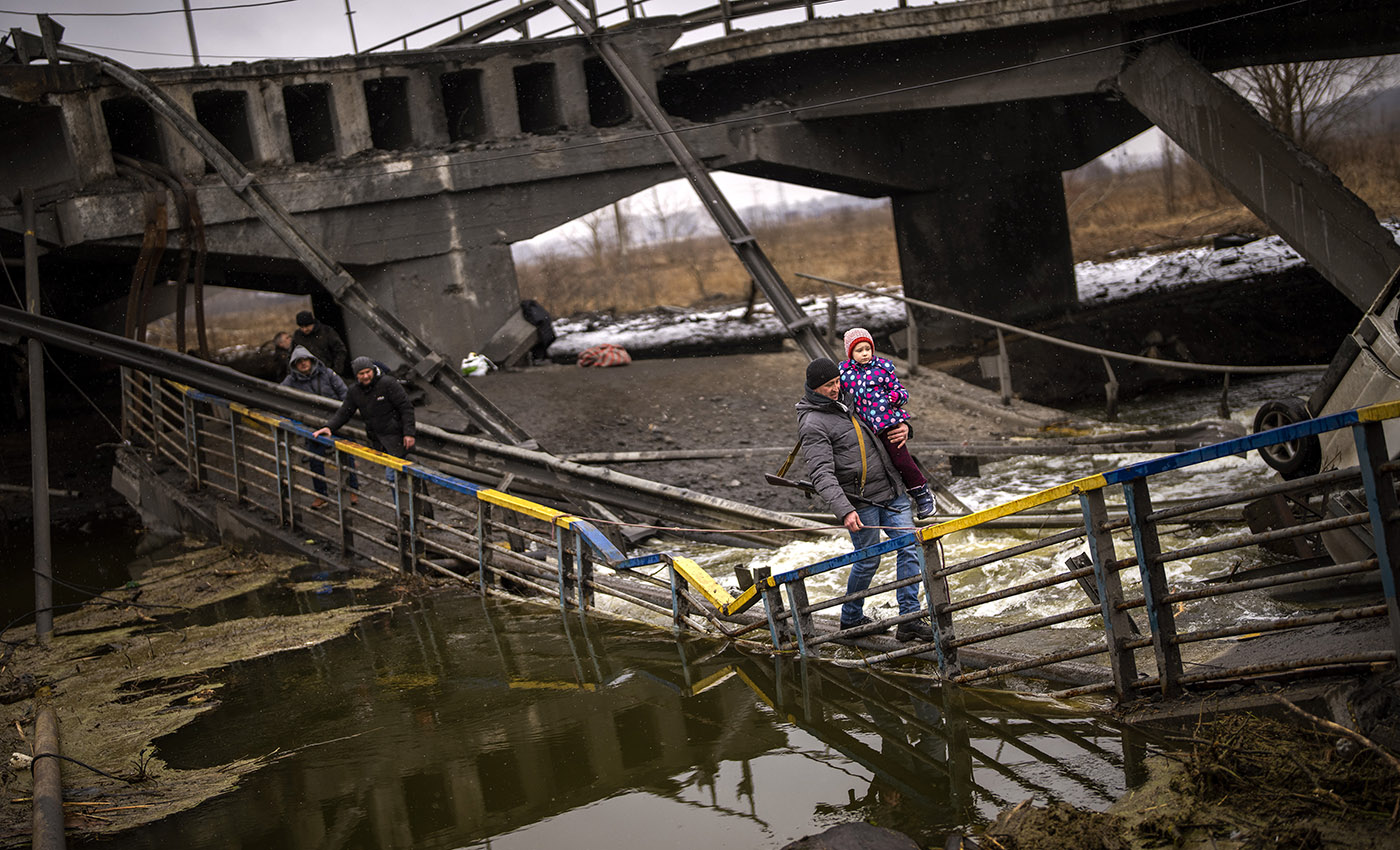 Ополченец помогает бегущей семье перейти разрушенный мост на окраине Киева, Украина, 2 марта 2022 года. Фото: Emilio Morenatti / AP