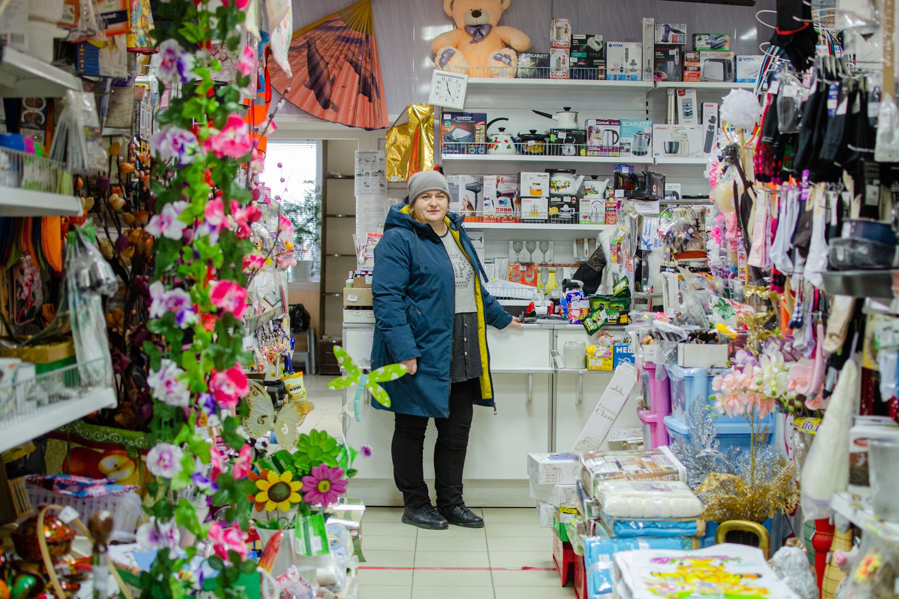 Ирина Васюкова заходит в торговый зал и выбирает фонарики (их просили привезти солдаты, когда она была у них в последний раз).