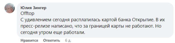25 февраля пользователи пожаловался на то, что карточки «Альфа-банка» не принимали в Таиланде, а в Германии — «Сбербанка». При этом картой попавшего под санкции «Открытия» в тот день кому-то удавалось расплатиться в Болгарии и других странах.