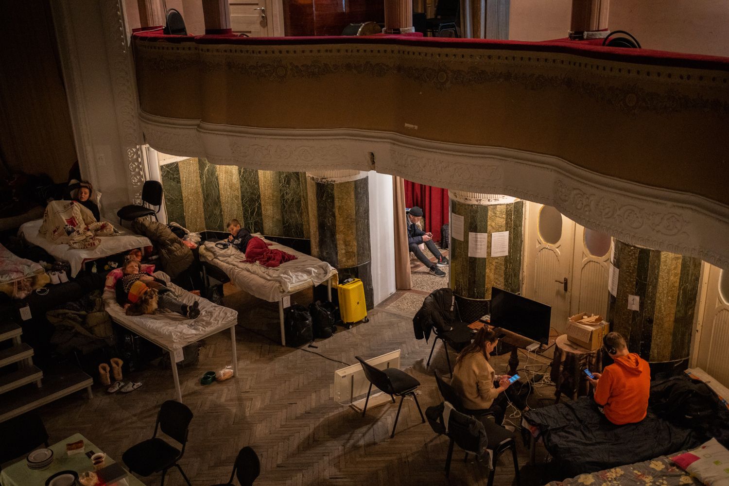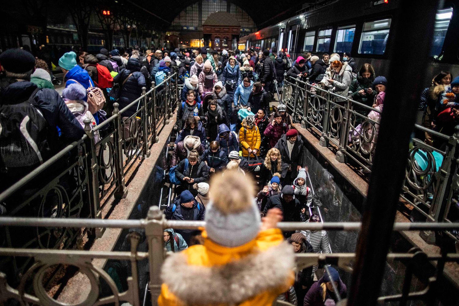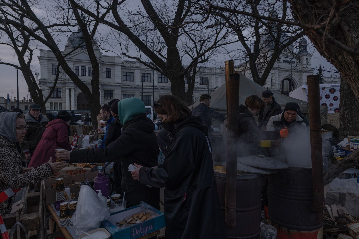 Во Львов люди прибывают на бесплатных эвакуационных поездах из Киева, Харькова и других пострадавших от бомбардировок городов. Волонтеры развернули на вокзале большие палатки для обогрева, раздают еду и воду, теплые пледы, одежду. В нескольких железных бочках развели костер, возле них тоже греются люди. Кто-то притащил на вокзал пианино — теперь на нем играют все желающие.