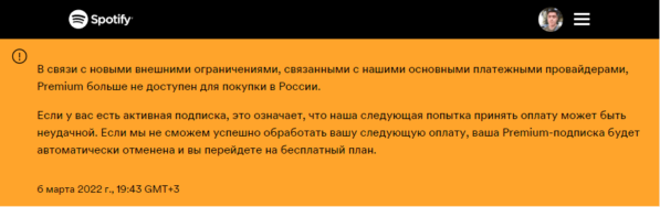 Spotify объявил, что подписка Premium больше не доступна в России из-за «новых внешних ограничений», которые связаны с приостановкой работы платёжных систем Visa и Mastercard. Объявление об этом расположено на сайте сервиса.