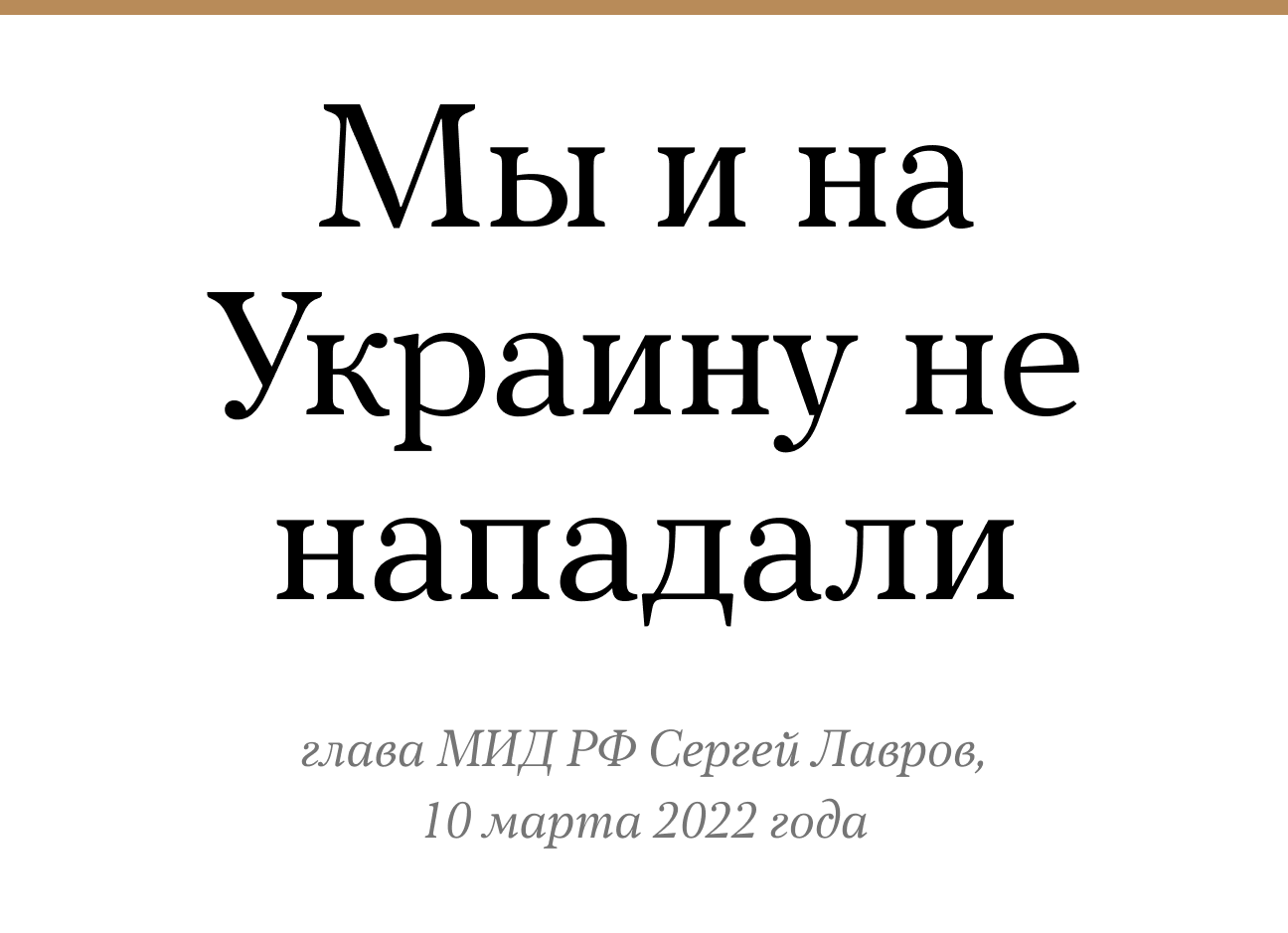 Министр иностранных дел РФ Сергей Лавров 10 марта провел в Турции переговоры с главой МИД Украины Дмитрием Кулебой. На пресс-конференции после встречи Лавров, в частности, заявил: «Планируем ли мы нападать на другие страны? На другие страны мы нападать не планируем. Мы и на Украину не нападали. На Украине мы просто… объяснили многократно: наступила ситуация, которая создает прямые угрозы безопасности Российской Федерации».