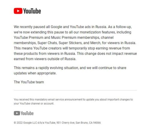 Это распространяется только на зрителей из России. Блогеры продолжат получать доход с тех, кто находится за её пределами. Уведомление о полном отключении монетизации получили авторы контента в РФ.
