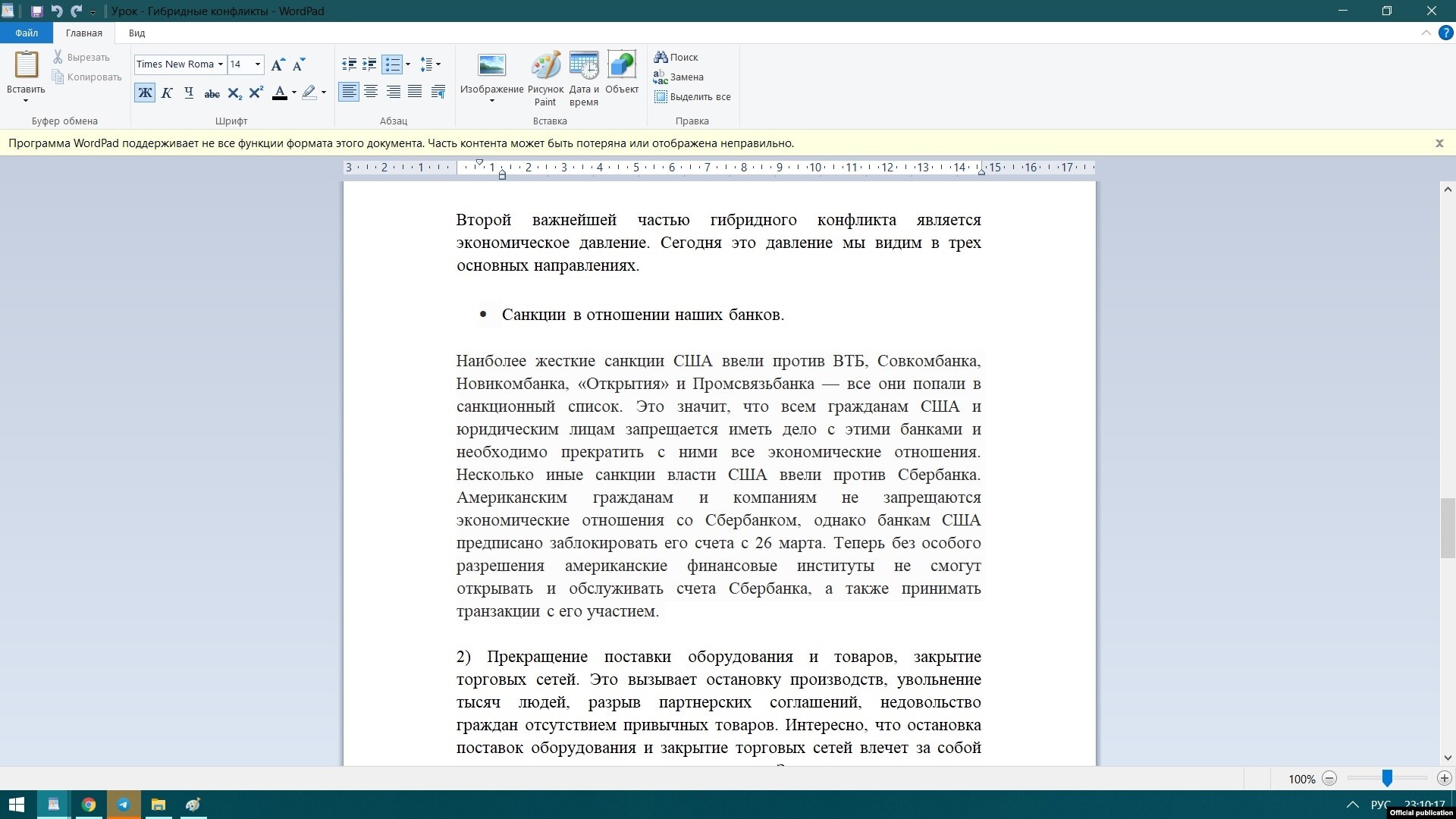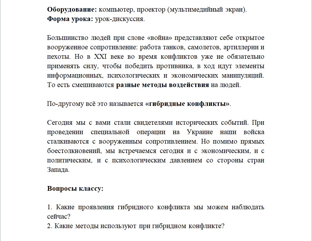 "Большинство людей при слове "война" представляют себе открытое вооруженное сопротивление: работа танков, самолетов, артиллерии и пехоты. Но в XXI веке во время конфликтов уже не обязательно применять силу, чтобы победить противника, в ход идут элементы информационных, психологических и экономических манипуляций. То есть смешиваются разные методы воздействия на людей. По-другому всё это называется "гибридные конфликты".