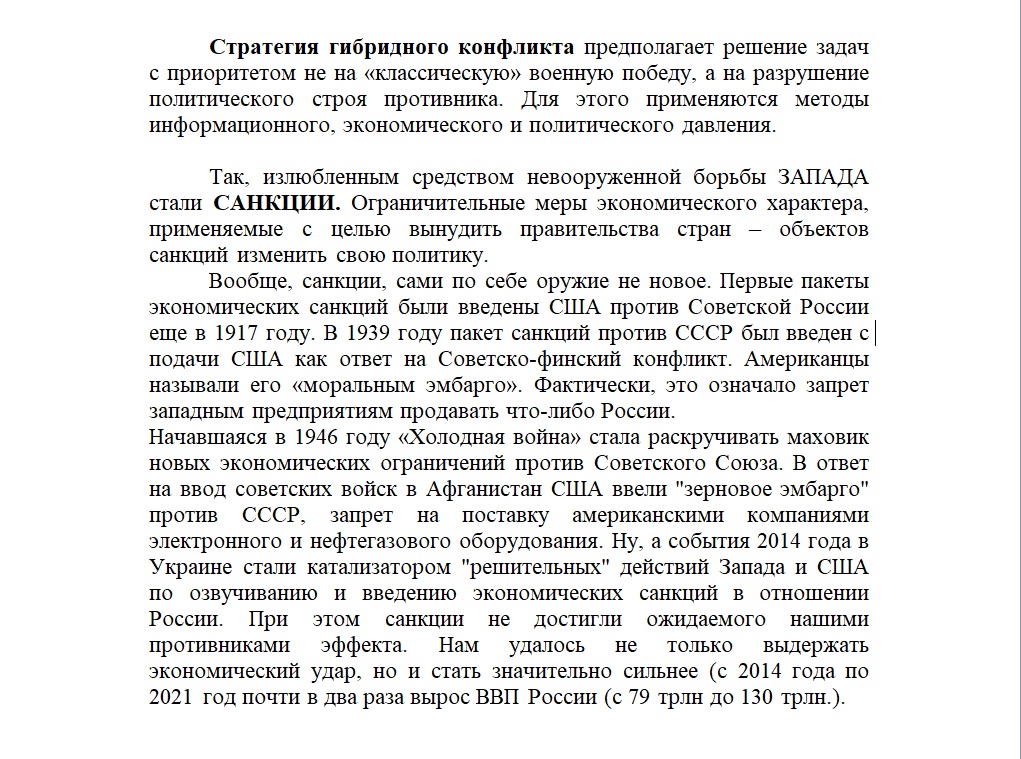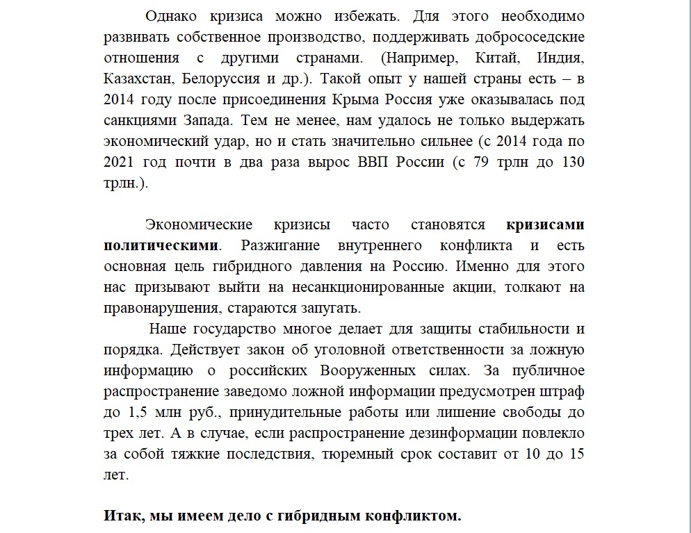 "Эти меры направлены на искусственное создание серьезного экономического кризиса. Их цель — подрыв финансовой устойчивости России, падение доходов граждан, создание безработицы… Такой опыт у нашей страны есть — в 2014 году после присоединения Крыма Россия уже оказывалась под санкциями Запада. Тем не менее нам удалось не только выдержать экономический удар, но и стать значительно сильнее (с 2014 года по 2021 год почти в два раза вырос ВВП России (с 79 трлн до 130 трлн.)".