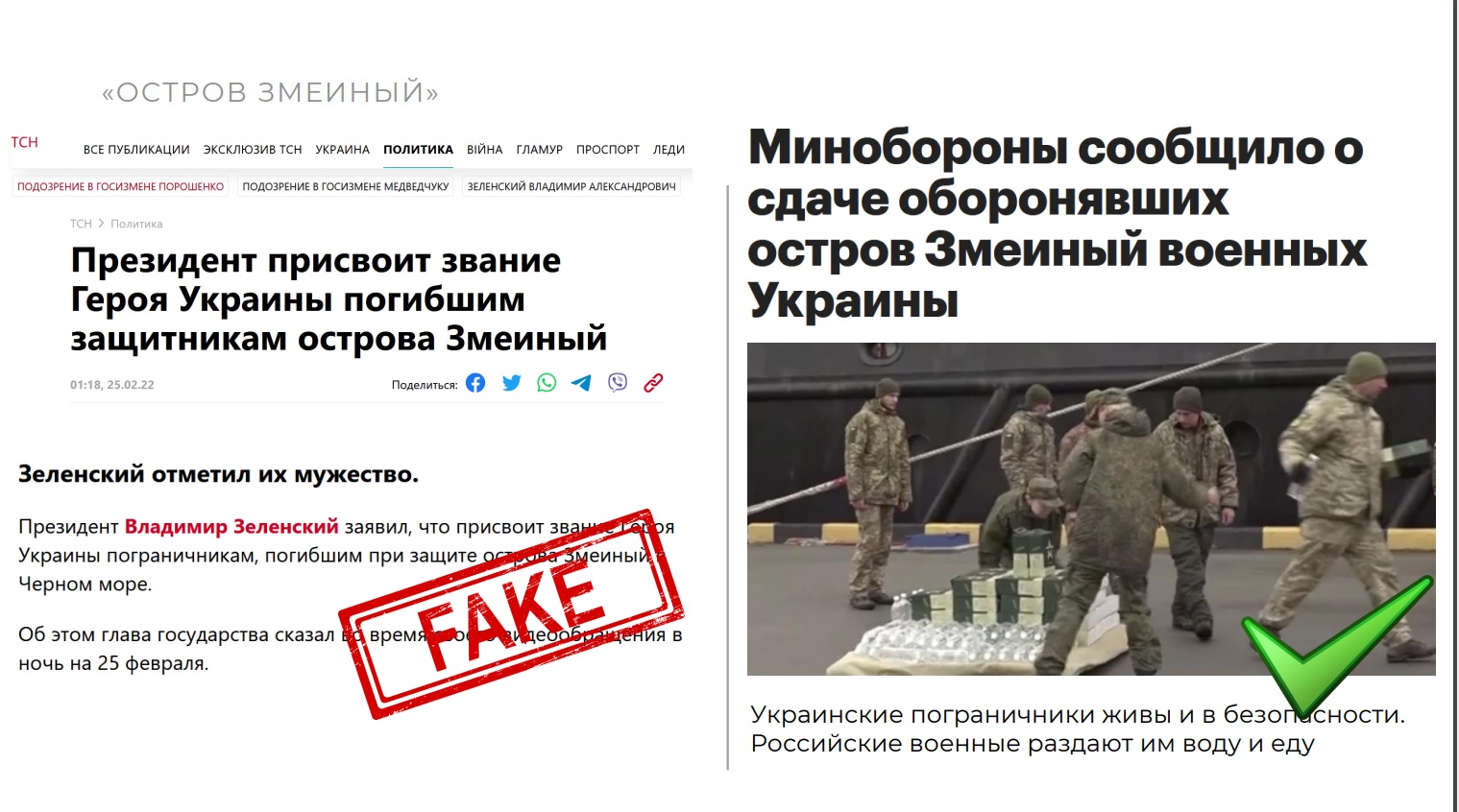 Наиболее выигрышно позиция российской стороны на первый взгляд выглядит в случае с пограничниками с острова Змеиный. Погранзаставу на этом острове разгромили из орудий с российских кораблей после того, как украинские пограничники на предложение сдаться отреагировали фразой: "Русский военный корабль, иди на ...". Связь с погранзаставой была утеряна, и украинская сторона пришла к выводу, что военные на Змеином погибли.