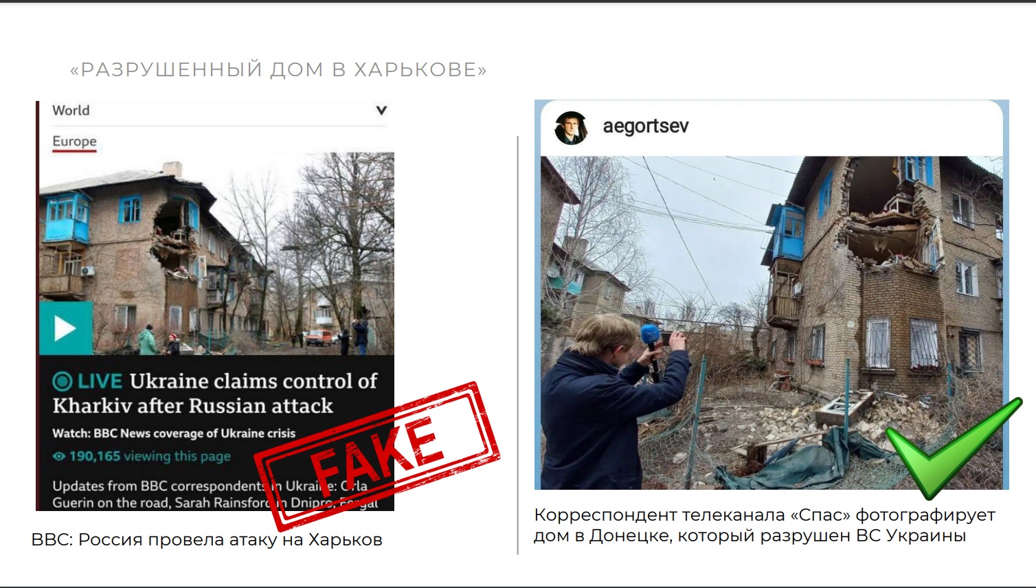 Кроме того, "разоблачено" как "фейк" фото, якобы размещенное в заметке BBC про обстрел Харькова. Авторы методичек утверждают, что на самом деле это фото сделано в Донецке — после попадания в дом снаряда украинской армии. Однако они не размещают ссылок ни на статью с "фейком", ни на статью с "пруфом". Более того — дальше следует голословное утверждение: