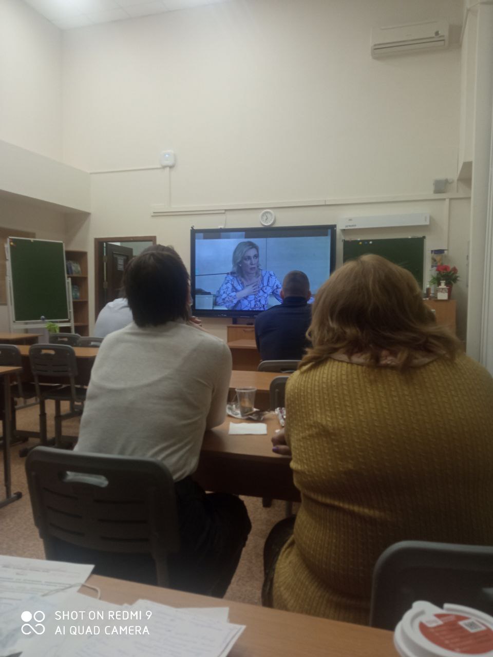 Возможность задать вопросы были у отобранных по желанию учителей, которые сидели в отдельном помещении; остальные просто смотрели трансляцию.