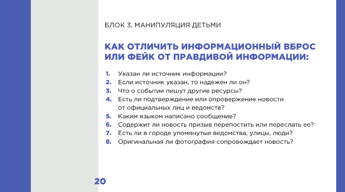 Виктория также видит противоречие в том, что авторы методички, используя детей в качестве аргумента, пишут, что государство приняло решение ограничить доступ к ряду платформ, которые распространяют недостоверную, по мнению властей, информацию. При этом в дальнейших рекомендациях советуют не скрывать от детей информацию.
