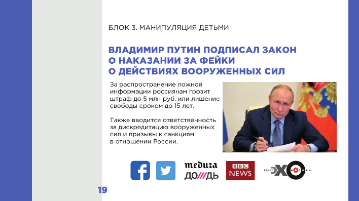 На 19-м слайде отдельно разбирается закон о «фейках», по которому за распространение недостоверной информации о действиях вооруженных сил россиянам грозит до 15 лет лишения свободы (принят 4 марта 2022 года). Сотрудникам образовательных учреждений предлагают рассказать родителям, что работу «некоторых информационных платформ» в России приостанавливают «в целях информационной гигиены, во избежание паники и стресса» и «с целью безопасности, так как последствия от вмешательства в психику детей могут быть фатальными».