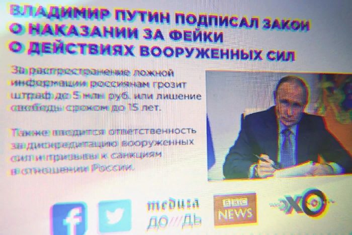 На самом слайде — логотипы фейсбука, твиттера, «Медузы», «Дождя», «Би-би-си» и «Эха Москвы». Сайты всех этих соцсетей и изданий были заблокированы после начала боевых действий в Украине из-за «распространения фейков», вещание «Дождя» прекратили, а «Эхо Москвы» полностью ликвидировали.