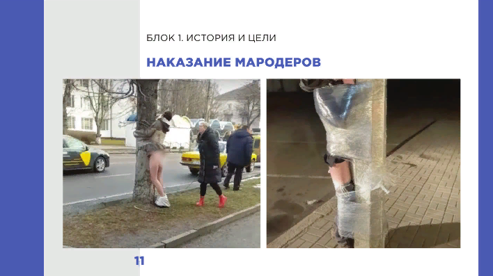 Слайд 11. «Пропагандисты дошли до того, что открывают счет для пожертвований на вооружение Украины, что позволяет мирному населению вооружиться до зубов и сформировать собственные войска так называемой самообороны, которая борется с мародерством, хотя, по факту, они занимаются террором своих же граждан и безнаказанными преступлениями. Не гнушаются даже деньгами обманутых пропагандой стариков», — говорится в методичке. На самом слайде — фотография неизвестного происхождения, на которой запечатлена женщина со спущенными штанами, примотанная скотчем к дереву.