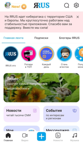 После скачивания приложения ЯRus предлагает зарегистрироваться с помощью номера телефона, войти через аккаунт Apple, Google или «Яндекс», страницу во «ВКонтакте» или в «Одноклассниках». После регистрации пользователь попадает на главную страницу с объявлением-предупреждением о нестабильной работе сервиса из-за «кибератаки с территории США и Европы».