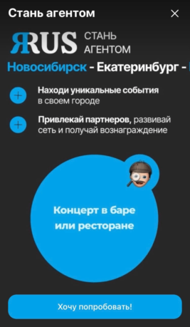 Ещё один раздел соцсети — «События», где можно увидеть афиши концертов, театральных представлений, мастер-классов и других мероприятий в своём городе. Приложение предлагает пользователям стать «агентами» — заполнять раздел об актуальных мероприятиях и привлекать партнёров за вознаграждение.