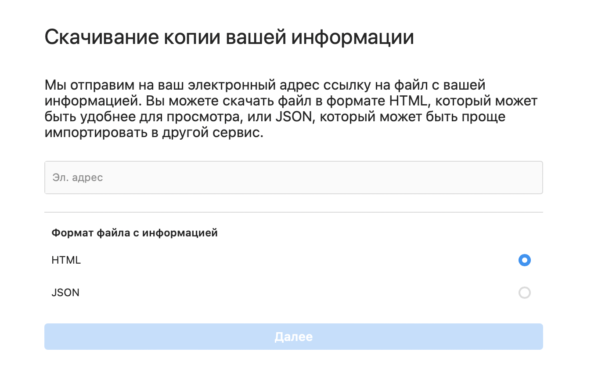 На подготовку файлов может потребоваться несколько дней. Когда материалы можно будет скачать, пользователь получит уведомление.Чтобы скачать копию запрошенных данных: