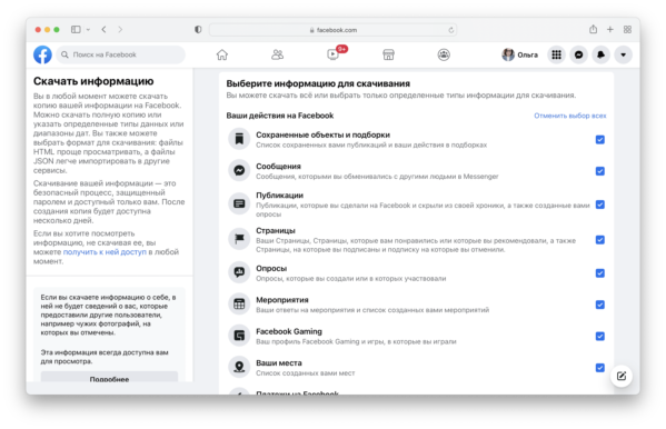 Чтобы скачать копию своих данных с фейсбука, воспользуйтесь соответствующим инструментом.