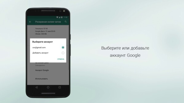 - Выберите аккаунт Google, в котором будет храниться резервная копия истории ваших чатов. Если у вас нет подключённого аккаунта Google, нажмите «Добавить аккаунт» при появлении запроса и введите учётные данные для входа.