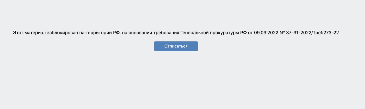 В сообщении говорится, что паблик заблокирован по требованию Генпрокуратуры, которая выявила «информационные ресурсы, на которых систематически размещается недостоверная общественно значимая информация о проводимой Вооруженными Силами Российской Федерации специальной военной операции».