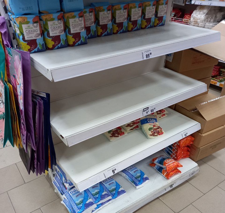 11:20 Читатели прислали Тайге. инфо фотографию полок одного из новосибирских магазинов сети «Мария-Ра». На них нет самого дешевого сахара и почти нет самой дешевой соли. Эти же товары остаются, но в более дорогом сегменте.