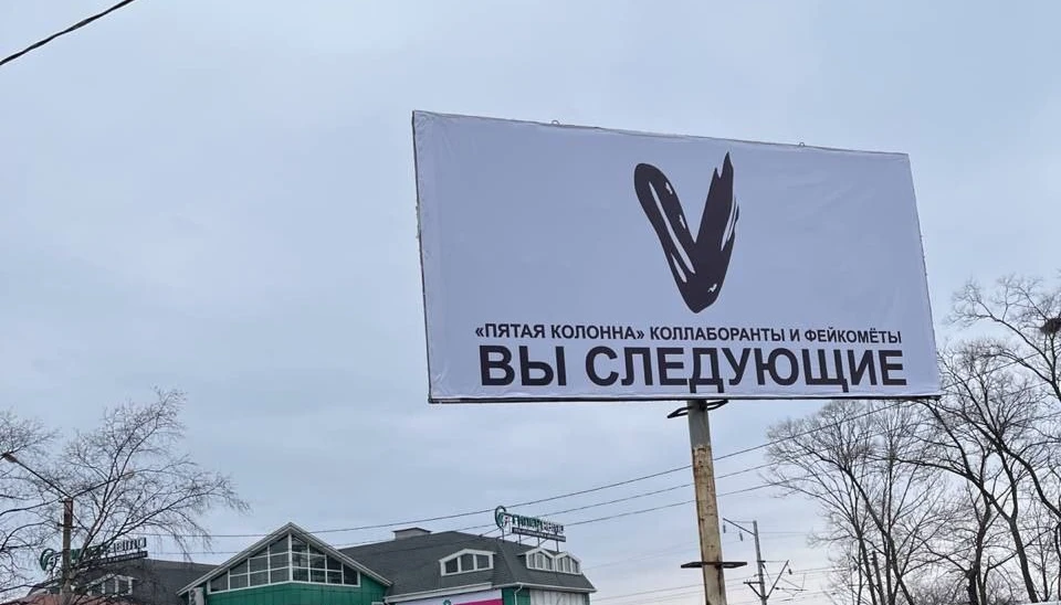 Там на нескольких рекламных щитах красуются огромные баннеры: «V «пятая колонна» коллаборанты и фейкометы ВЫ СЛЕДУЮЩИЕ». Их можно увидеть в том числе около городского автовокзала. Заказчики «социальной рекламы» отважно скрывают свои личности; пока даже непонятно, кого они назначат «пятой колонной». Администрация города, краевые власти и полиция пока никак не прокомментировали содержание вывесок и их законность.