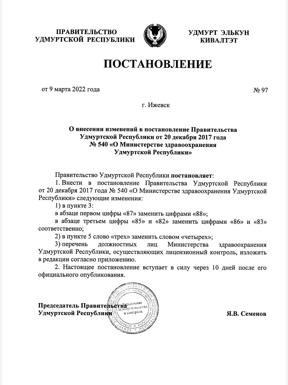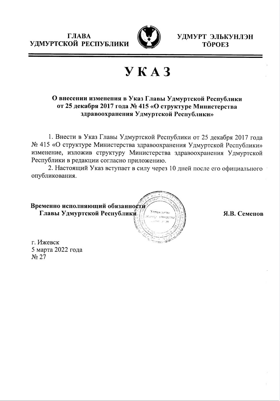 Согласно последнему указу Главы Удмуртской Республики Бречалова, изданному 5 марта 2022, в структуру Минздрава Удмуртии входит 31 управление, сектор и отдел, плюс 4 заместителя министра и 1 помощник министра (и это еще не считая вице-премьера по здравоохранению Пинчук, специально для которой была создана должность в Правительстве).