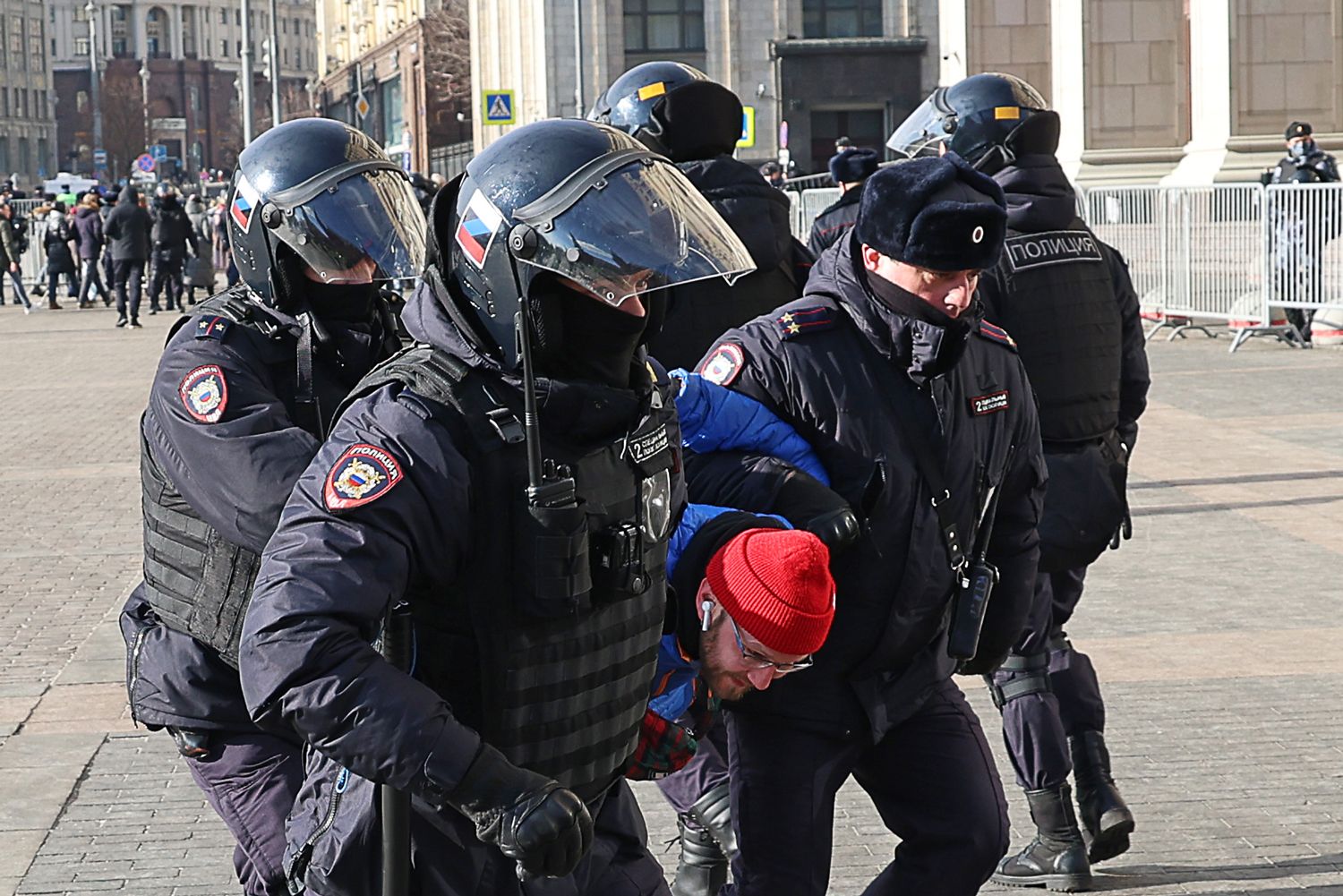 Вячеслав Прокофьев / ТАСС Z на шлемах бойцов ОМОН, разгоняющих антивоенную акцию на Манежной площади в Москве. 13 марта 2022 года