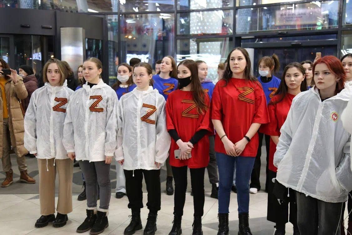 Особенно обсуждаемыми стали два события в Казани. Сперва 5 марта своих подопечных буквой Z выстроил местный детский хоспис. А затем 9 марта в торговом центре Kazan Mall прошла акция, в которой участвовали студенты Казанского государственного института культуры (КазГИК): одетые в белые балахоны с приколотыми на них георгиевскими ленточками в форме буквы Z, студенты вскидывали в воздух попеременно правую и левую руку со сжатым кулаком, скандировали лозунг «За мир!» и исполняли песню Олега Газманова «Вперед, Россия!».