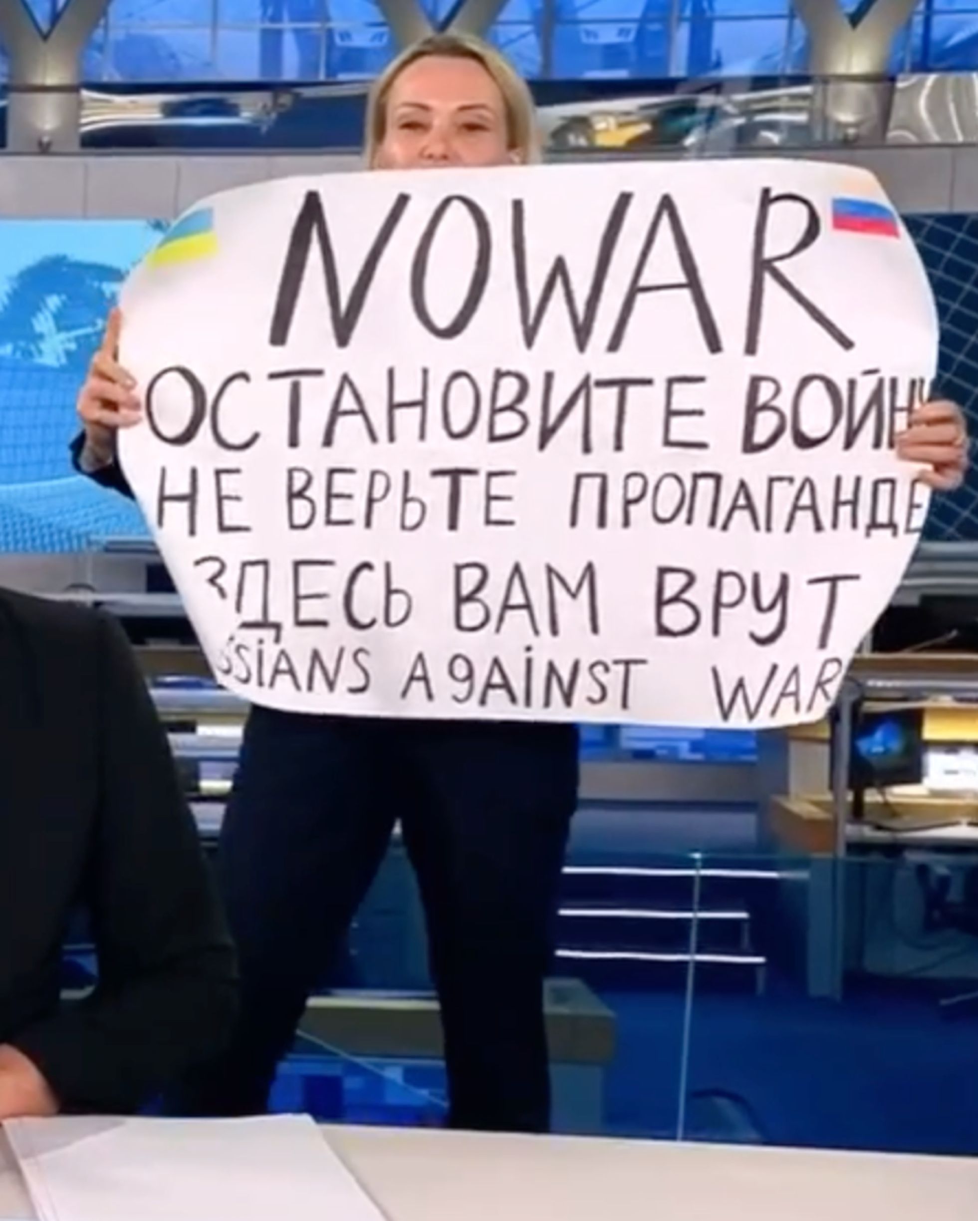 During a live broadcast on Monday evening, March 14, on Channel One Russian state television, a station employee named Marina Ovsyannikova ran out on stage behind the news anchor, unfurled an antiwar sign, and shouted antiwar slogans. Ovsyannikova managed just a few seconds on the air before the transmission cut away to another segment. She was later arrested, held overnight, convicted the following evening of the misdemeanor offense of inciting unpermitted protests in a prerecorded statement that circulated on social media, fined 30,000 rubles (roughly $250), and released. Federal investigators are still reviewing her televised protest and might press separate, possibly felony charges. Meduza spoke to Ovsyannikova’s colleagues and pieced together her story. Though she alone has even dared such a disruption of Russian broadcast television, Ovsyannikova’s personal opposition to the war against Ukraine is not uncommon among those who work for Russian state TV, Meduza learned.