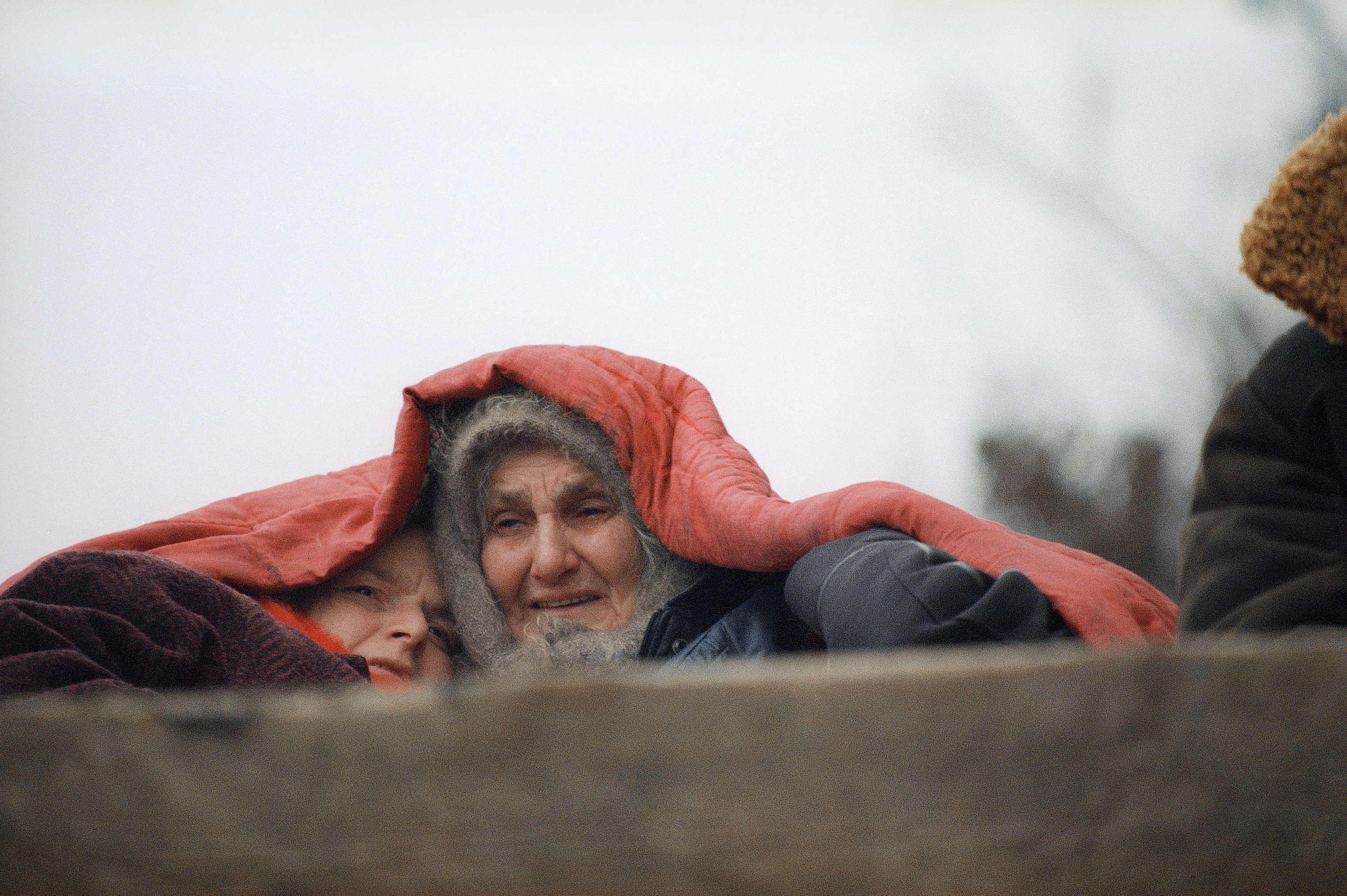Две беженки накрываются одеялом, выезжая из чеченского села Катыр-Юрт на кузове грузовика, 30 января 1995 года