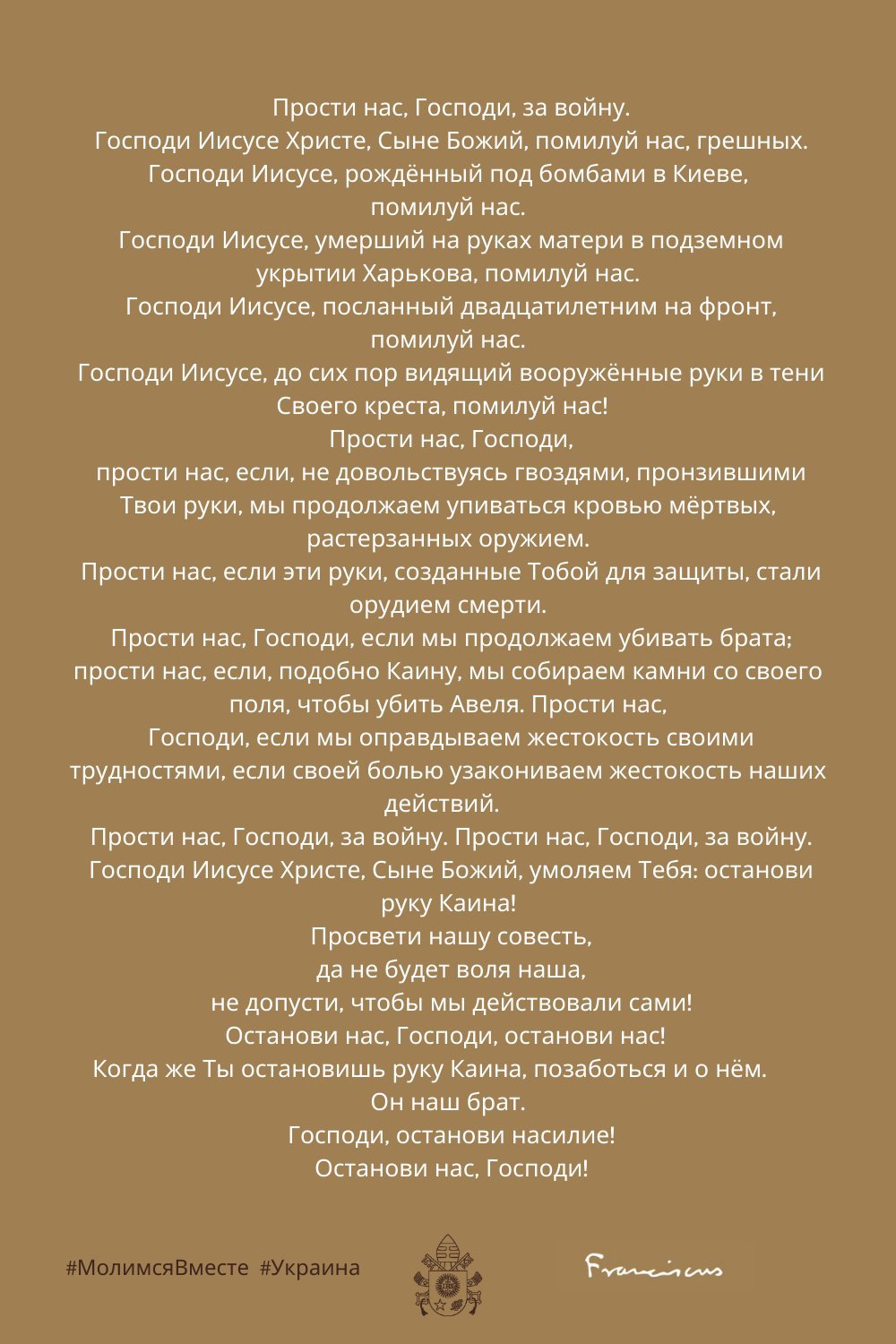 Пантифик опубликовал в твиттере текст молитвы за мир на русском, украинском и английском языках.