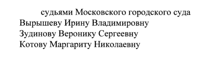 Кроме Котовой, судьями Мосгорсуда стали экс-председатель Басманного суда Ирина Вырышева, которая, как отмечает , уже работала в городской инстанции, и Вероника Зудинова из Королевского суда Московской области.