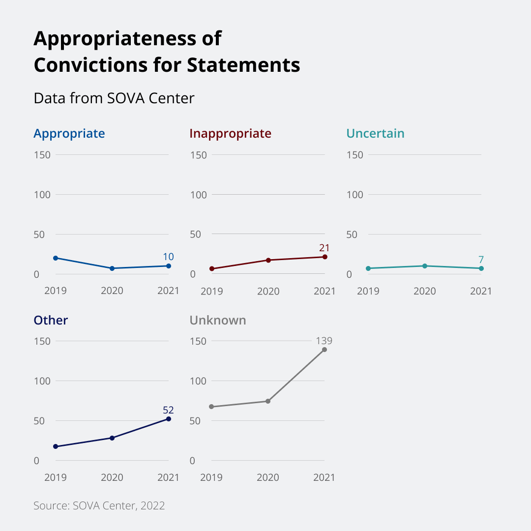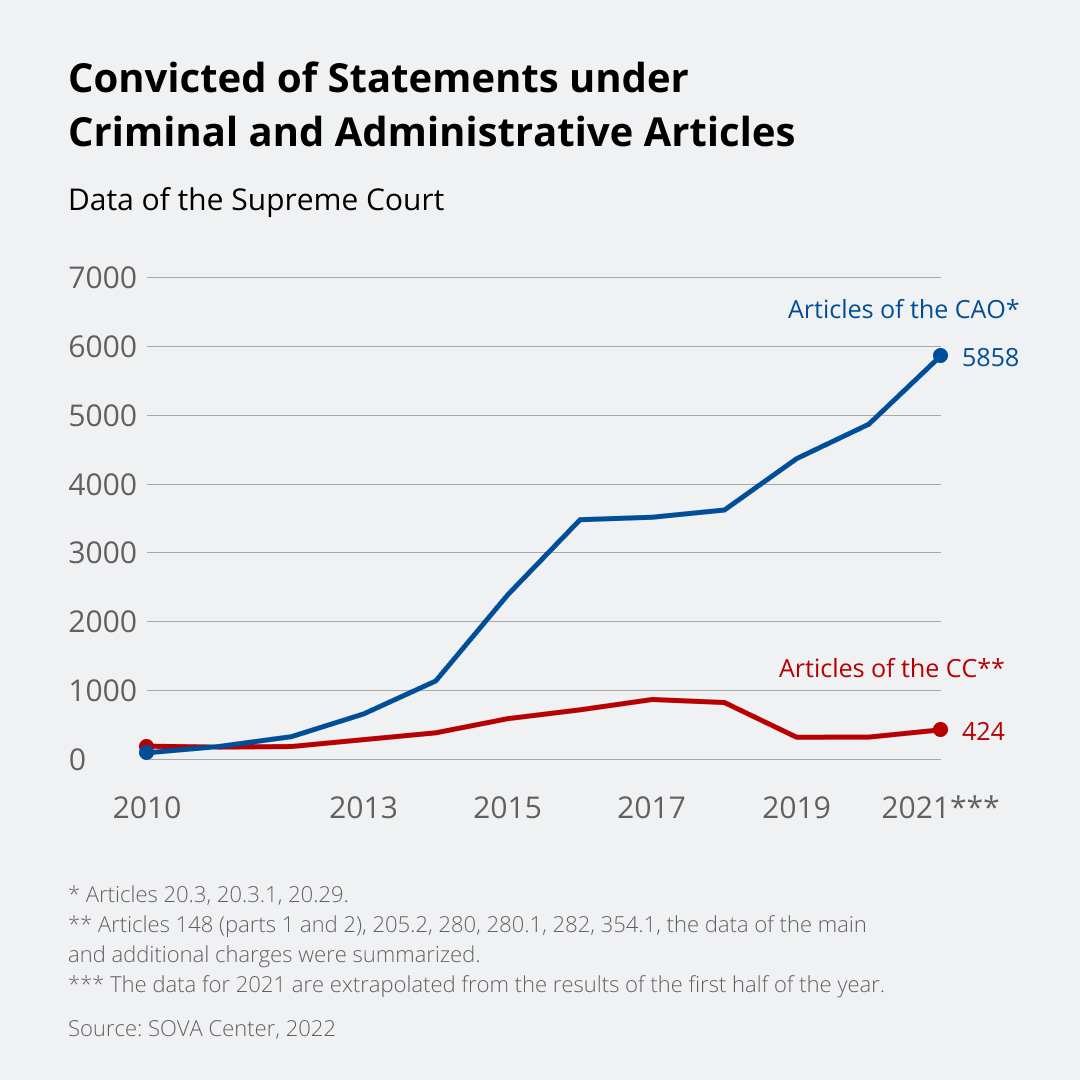 In 2021, we have witnessed an increase in the scale of criminal prosecution for "extremist statements." This increase was mainly contributed to by the numbers of those convicted under articles on public appeals to extremism and terrorism. The number of people convicted under other articles on public statements has also increased, but especially those convicted under the article on "insulting believers' religious feelings."