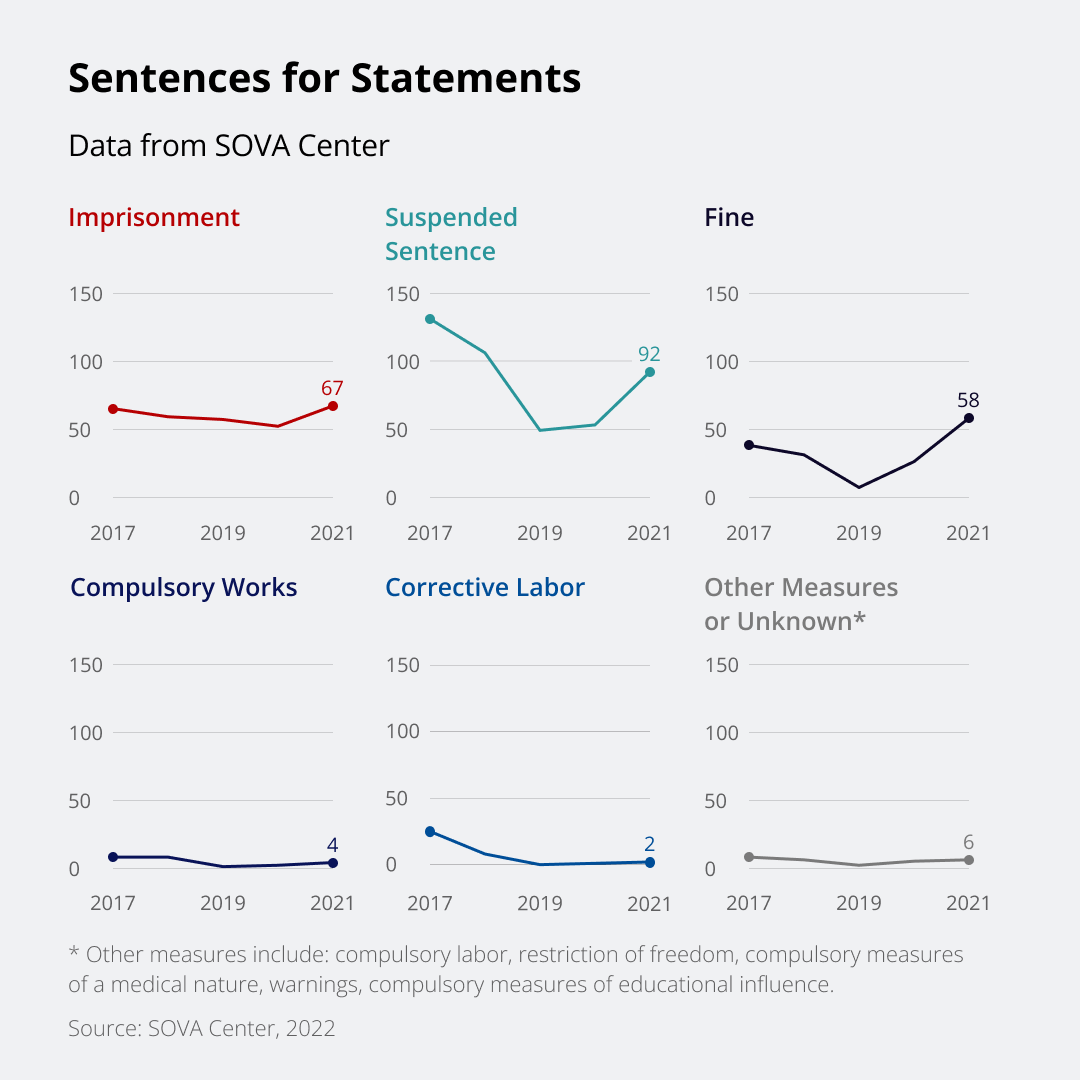 The number of convictions for offline statements (17 for 19 people) turned out to be roughly the same as in 2020 (12 for 20 people). They were distributed as follows: