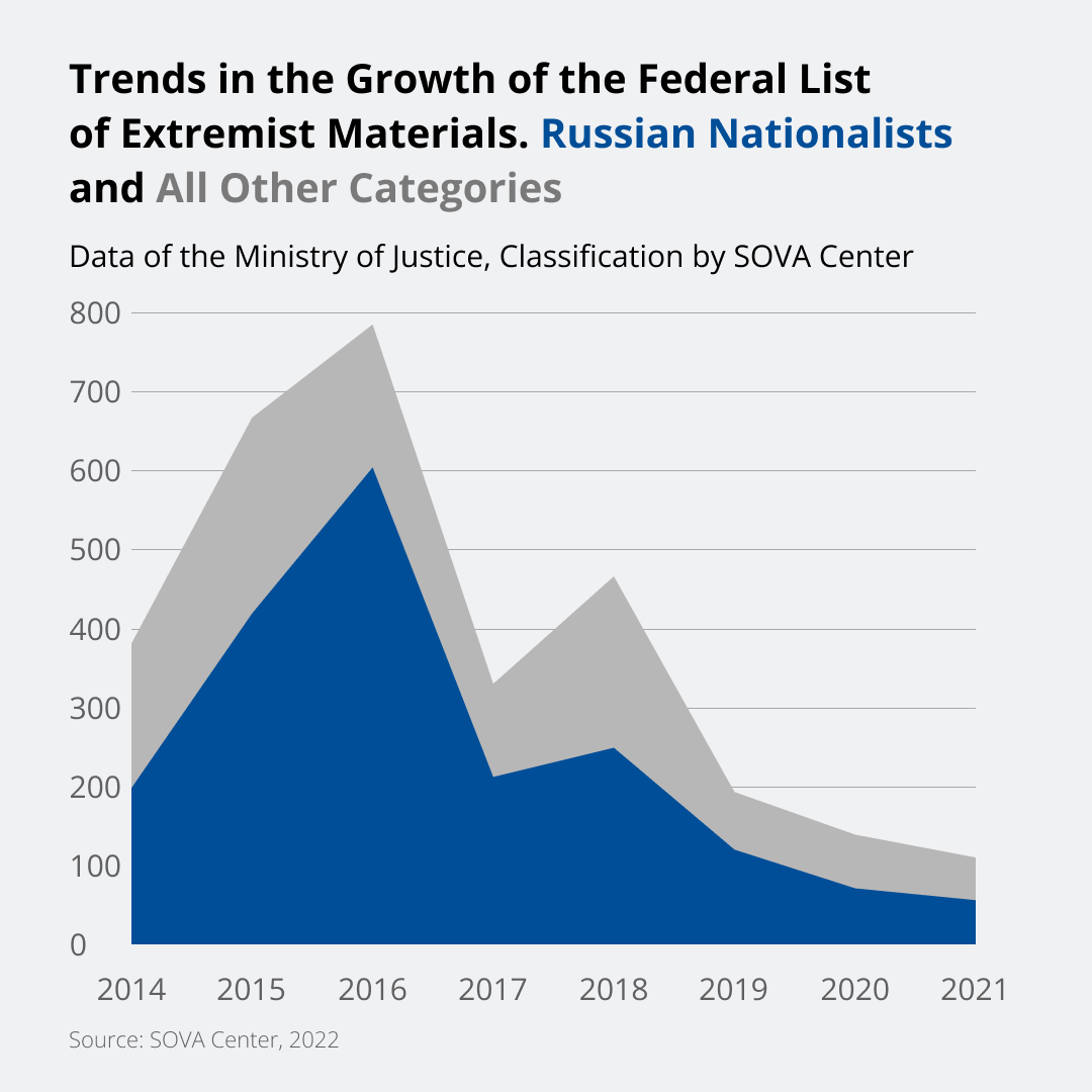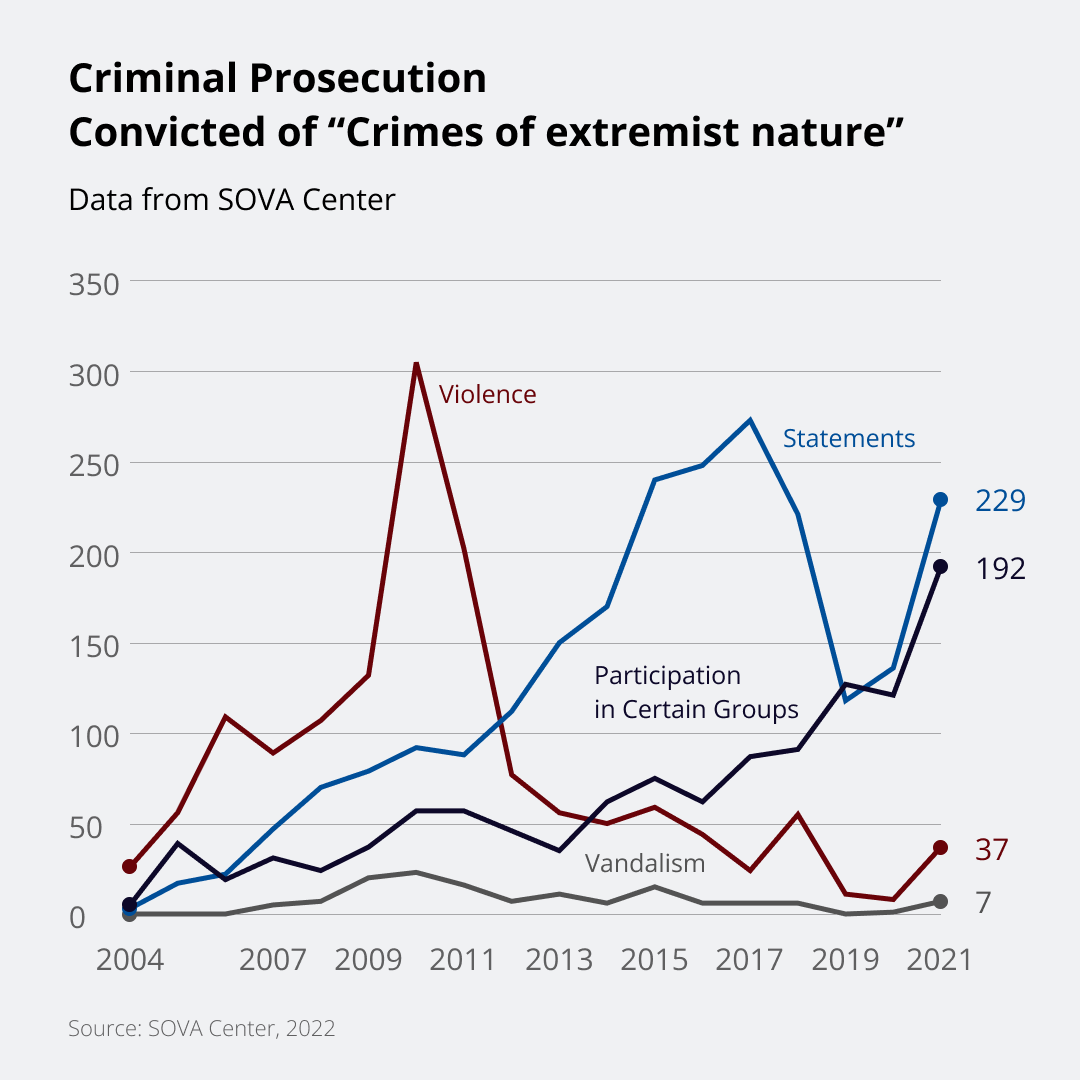 No official statistics on counteraction to extremism in 2021 are available yet, but the Chief Justice of the Supreme Court Lebedev recently reported that 606 people were convicted of "extremist crimes" last year, compared to 325 a year earlier.[4] There has not been such a sharp increase since at least the early 2010s. This category includes hate crimes against people or property, participation in extremist communities, and most of what we call "extremist statements."