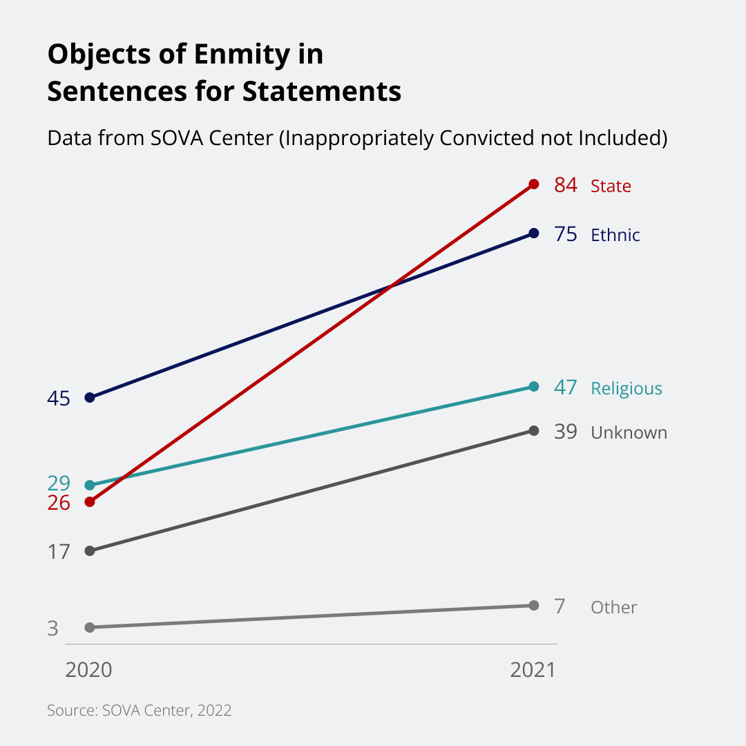 Comparing the overall increase in the number of sentences, quoted by Lebedev, with the data from our two reports, it is possible to claim that in 2021, law enforcement in all types of "extremist crimes" has sharply intensified.