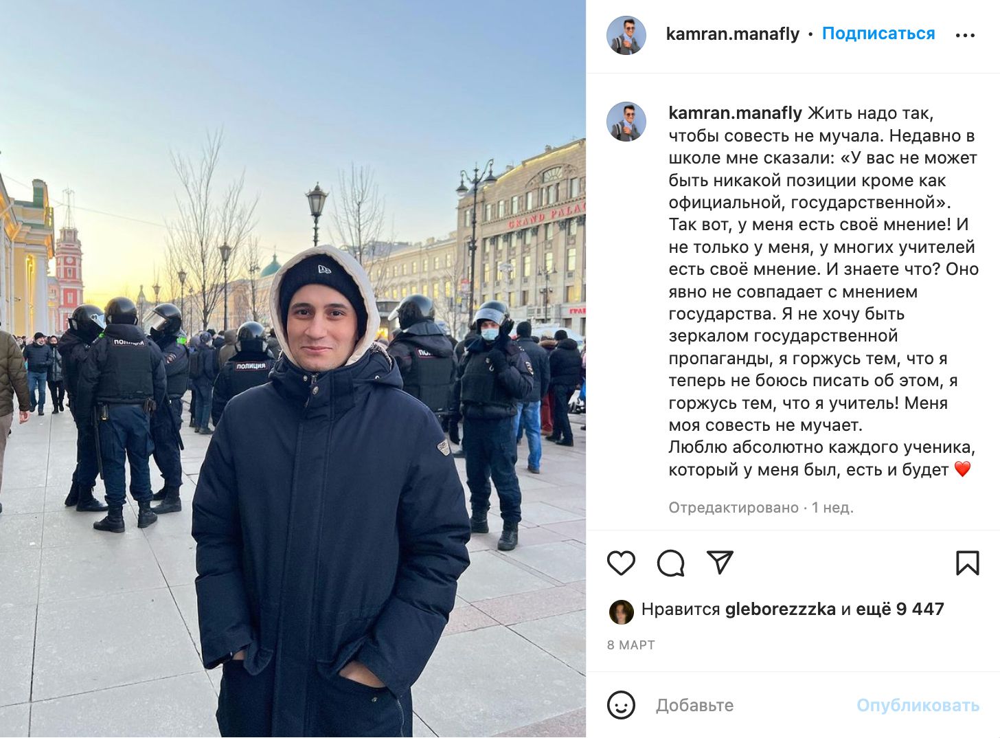 Кямран Манафлы — 28-летний учитель географии из Москвы. Он отказался рассказывать своим ученикам о войне по государственным методичкам, оправдывающим «специальную операцию» в Украине. После того, как он выложил в инстаграм свое фото с митинга и написал, что «не хочет быть зеркалом государственной пропаганды», его уволили из школы за «аморальное поведение». «Медуза» поговорила с Кямраном о его увольнении и о том, почему он решил уехать из России.