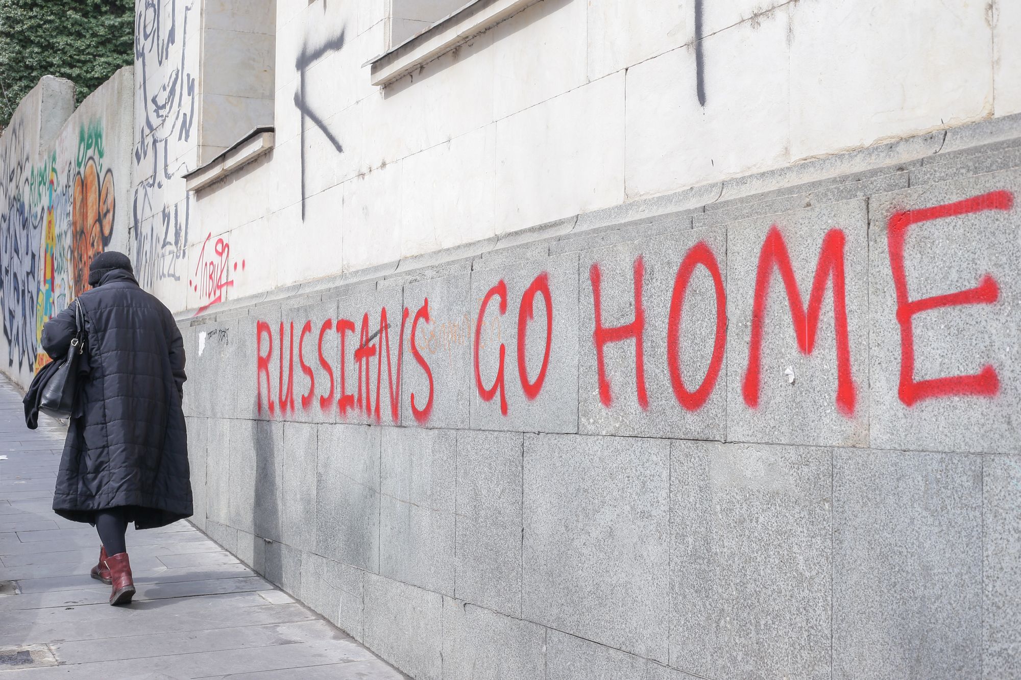 Поддержка Украины сопровождается и ростом антироссийских настроений. На улицах нередки надписи «FUCK RUSSIA» (к черту Россию) и «RUSSIANS GO HOME» (россияне, уезжайте домой). На урнах пишут «бункер Путина», а на столбах можно встретить наклейки, которые призывают не покупать российские товары. Определить их предлагается по первым цифрам штрихкода: комбинация «460» означает, что продукт был произведен в России. Таких на полках продовольственных магазинов много — это и крупы, и молочная продукция, и масло, и консервы.